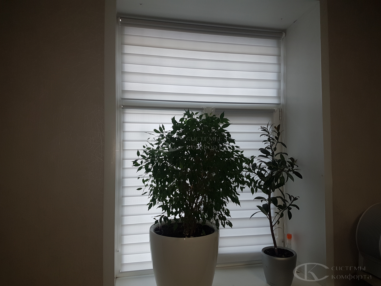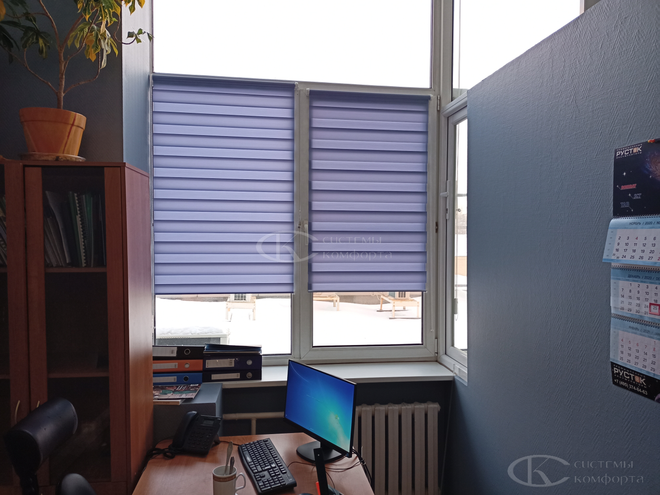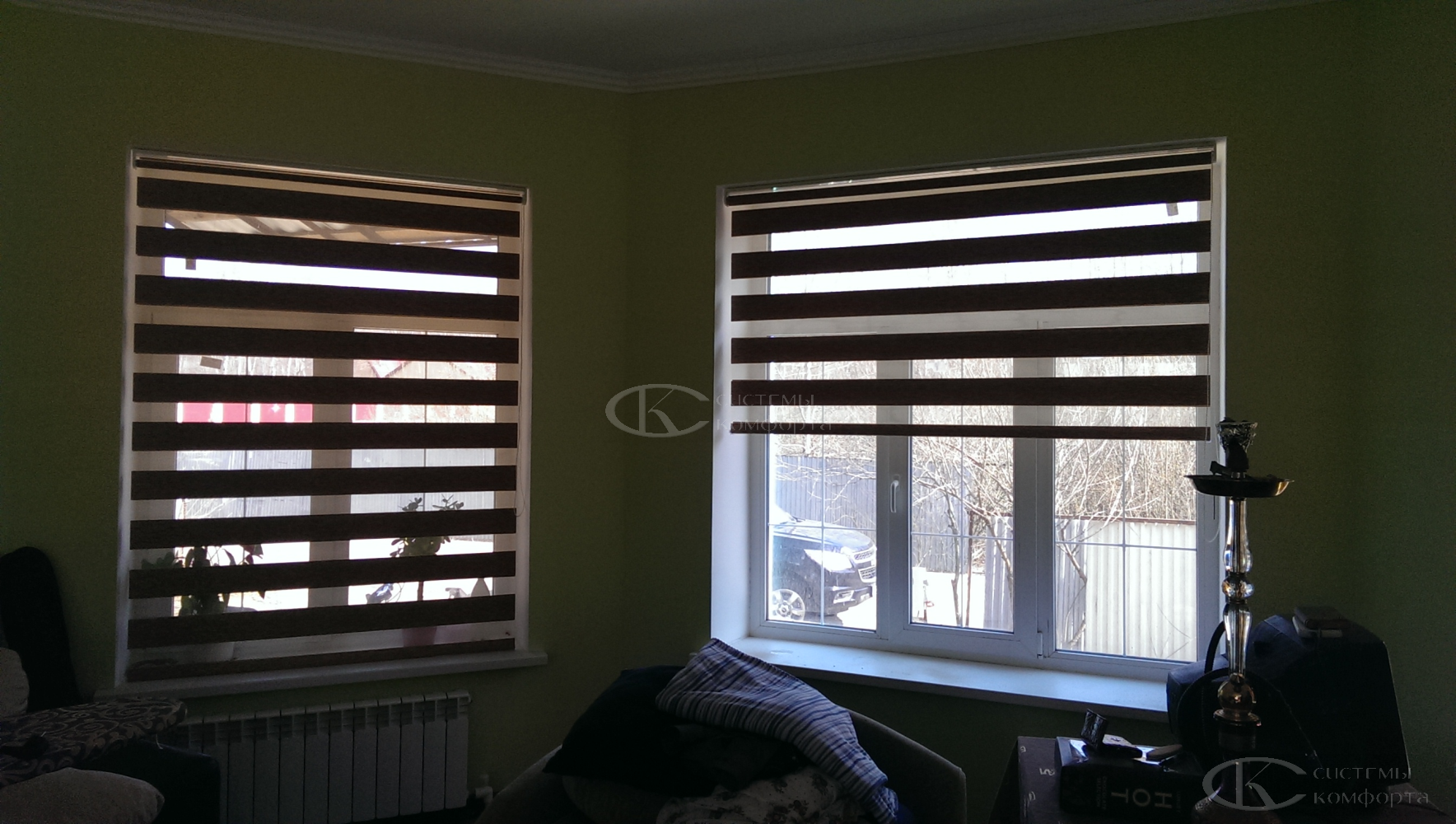 Эту модель штор производят из материалов с разными пропускными характеристиками солнечных лучей. Они позволяют создавать в помещении атмосферу темного и светлого времени суток. Такие шторы называются комбинированными. Второе их название — зебра или комбо.