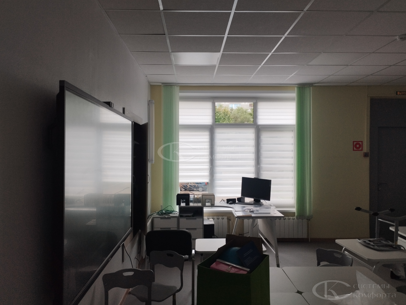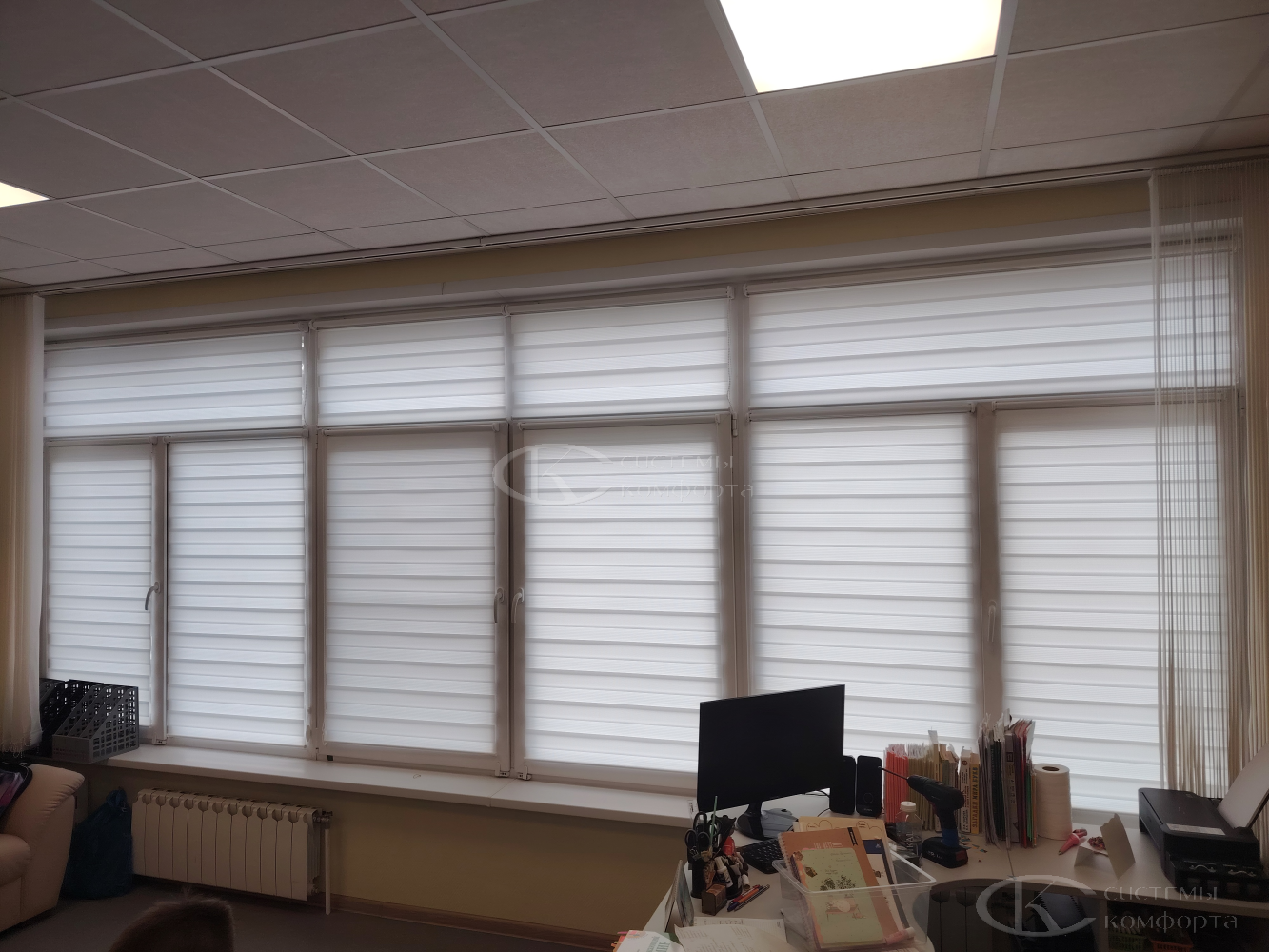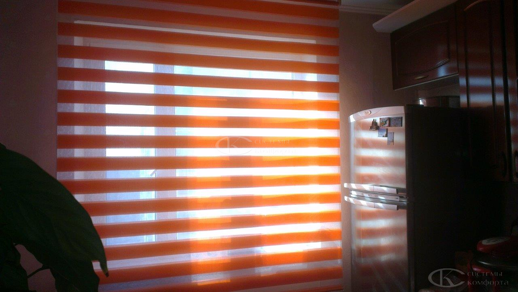 Эту модель штор производят из материалов с разными пропускными характеристиками солнечных лучей. Они позволяют создавать в помещении атмосферу темного и светлого времени суток. Такие шторы называются комбинированными. Второе их название — зебра или комбо.