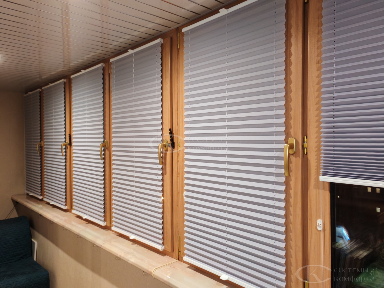 Достаточно дорогой вариант, сочетающий достоинства обычных пластиковых жалюзи и штор. Полотно собрано в чёткие складки, в опущенном виде выглядит как штора, а в собранном занимает минимум места. Особенно эффектно плиссированные жалюзи смотрятся на лоджиях с большой площадью остекления.