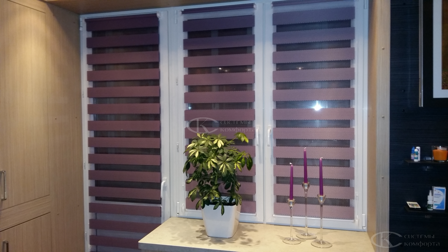 Это рулонные шторы для кухни, которые создаются из двух видов тканей, перемежающихся полосами. При помощи цепи управления можно смещать полосы из разной ткани относительно друг друга так, чтобы полотно стало состоящим только из более прозрачных или из более темных полос. Такие шторы смотрятся оригинально, при этом они неприхотливы в уходе: их просто протирают при необходимости влажной губкой.